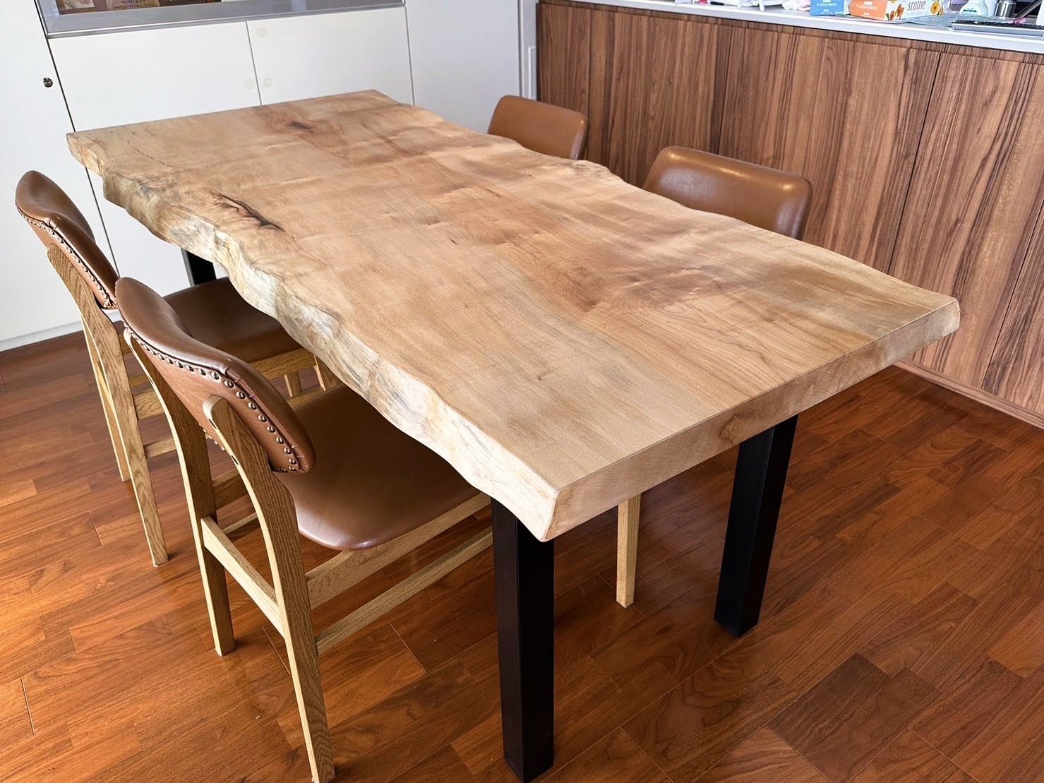 完成したテーブルは、ご自宅のナチュラルな木のフローリングやキャビネットとも相性が良く、まるで長くそこにあったかのように空間に溶け込んでいます。自然光の入るダイニングルームで、木の美しさがより一層際立ちます。