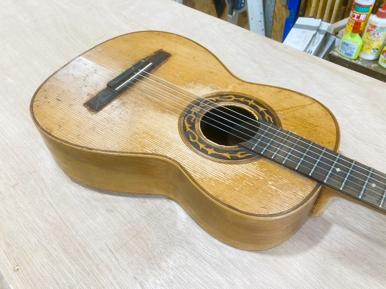今回お預かりしたのは、大正~昭和初期にスペインで製造された貴重なギター「Salvador Ibáñez e Hijos(サルバドール・イバニェス・エ・イーホス)」。経年による塗装の劣化や表面の傷が目立ち、演奏には支障が出ていました。思い出の詰まったこの1本を「再び音楽の時間へ戻したい」というご依頼でした。
