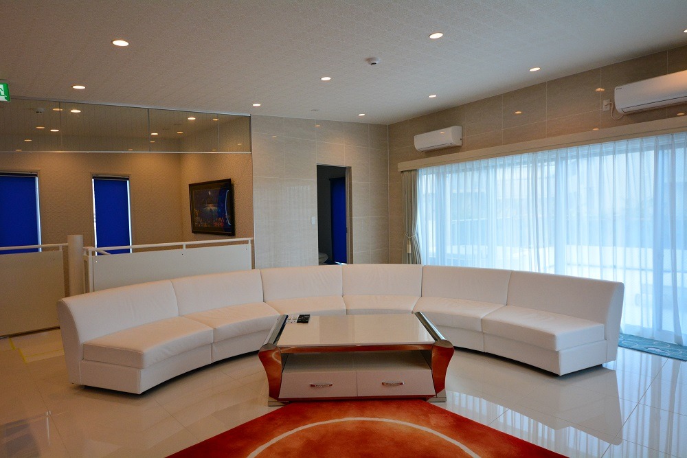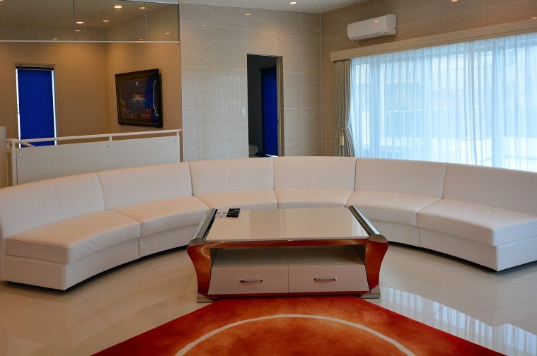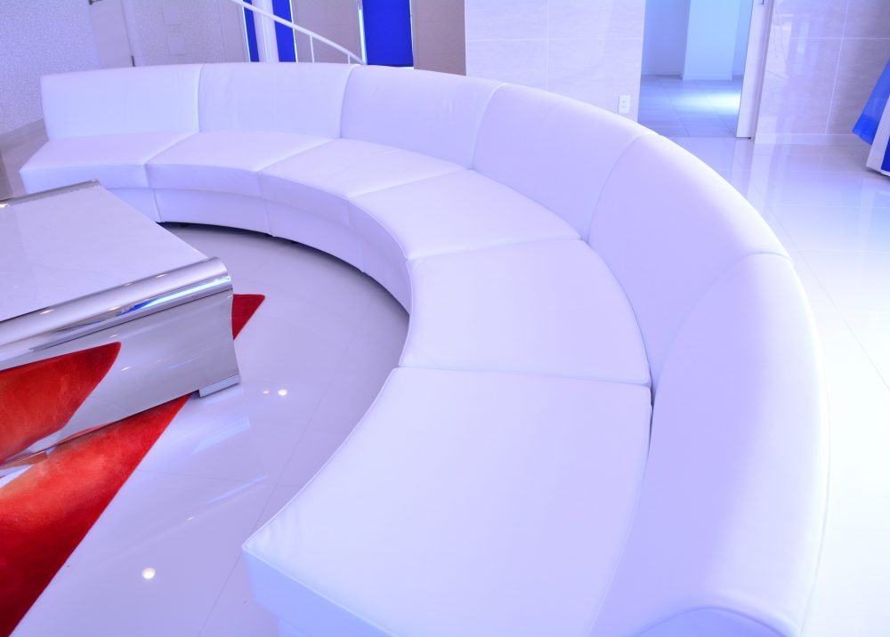 今回ご紹介するのは、江の島を望む宿泊施設のメインラウンジに設置された、特注の大型カーブソファです。