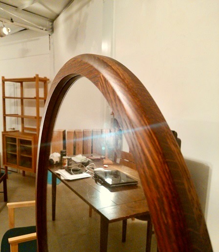 木枠に包まれた楕円形の鏡は、柔らかく女性らしい印象を与え、空間を明るく見せる効果もあります。鏡の縁も丁寧に面取りされており、手触りの滑らかさも魅力です。