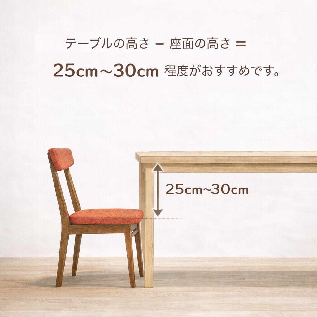 一般的にはテーブルの高さと座面の高さの差を「25cm〜30cmの間」