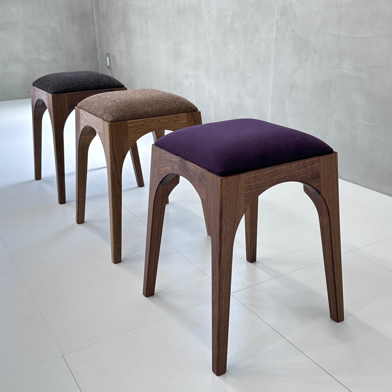 教会のアーチをモチーフにした脚部分は優雅さと安定感を併せ持っているだけでなく、クッションを含めた、スツール全体のデザインを脚のラインに合わせて丸みを持たせているため、シルエットが美しく見えます。